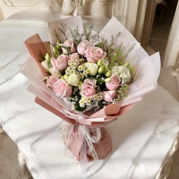 材質(料)說明: 粉玫瑰 白桔梗 洋甘菊 深山櫻 綠鈴草