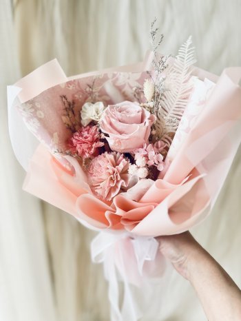 備註說明: *需3日前預訂(不含假日) *不凋花是鮮花製成,花朵保存期限至少2年以上,不凋花的觸感、色澤、形狀幾乎和真花一樣.(隨花束附保存方式)