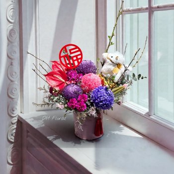 材質(料)說明: 牡丹菊等...以當季花材設計的喜氣花禮,